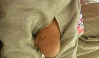 在小孩子哭鬧或奔跑的時候肚子上或大腿根部有鼓起來的包塊,如果在肚臍上可能就是臍疝,如果在腹股溝處發現可能就是腹股溝疝,在孩子安靜下來后或平臥時就會發現包塊消失了。如果在發現疝氣后一定要及早的進行治療。