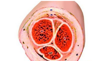 創傷促成陰莖纖維性海綿體炎發病的觀點已被普遍接受。臨床和病理檢查發現,所有斑塊位于陰莖背側或腹側中線,并附著于中隔纖維。陰莖白膜是分層結構,主要在陰莖背側和外側分層,外層為縱行纖維,內層為環行。在腹側中線陰莖白膜外層纖維稀少,形成單層。中隔纖維形成扇形和白膜內層纖維交織在一起形成環狀結構。